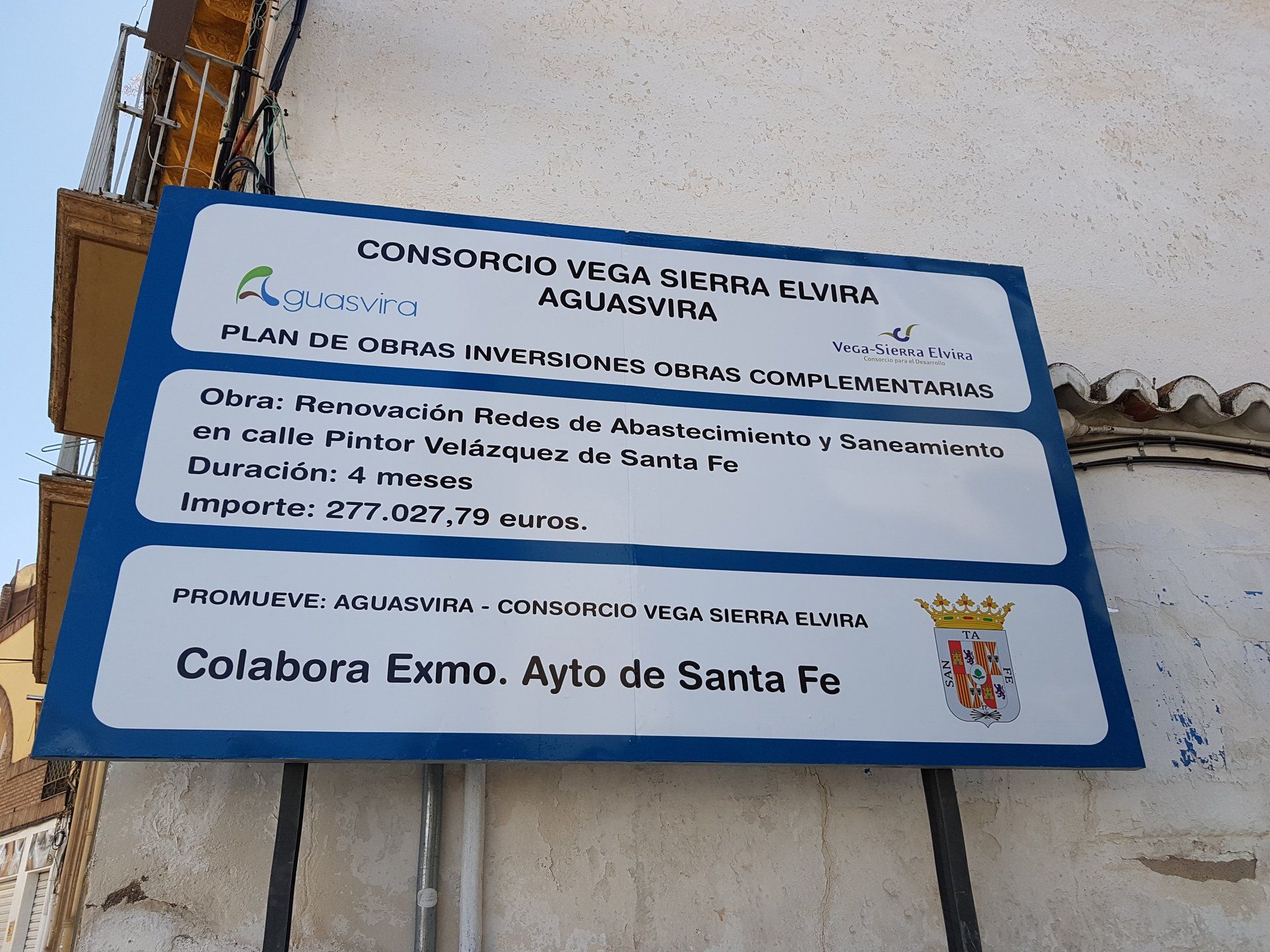 Con la colocación de este cartel en la mañana de hoy, la empresa Aguasvira - Consorcio Vega Sierra Elvira, anuncia nuevas obras en la calle Pintor Velázquez. El importe total de esta obra es de 277.027,29 euros, con una duración total de 4 meses. Estas obras consistirán en la Renovación de Redes de Abastecimiento y Saneamiento. Promovidas por Aguasvira - Consorcio Vega Sierra Elvira cuentan con la colaboración del Excelentísimo Ayuntamiento de Santa Fe.