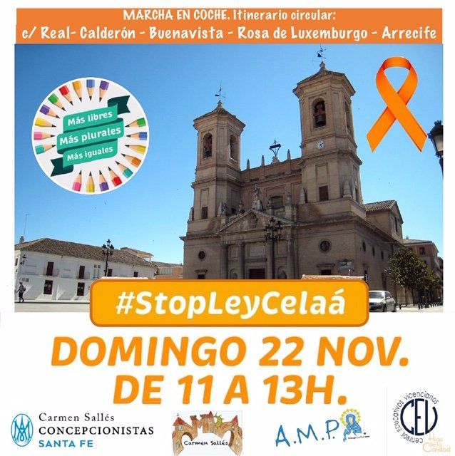 La Plataforma "Más Plurales" ha convocado a través de los dos colegios concertados de Santa Fe una manifestación en contra de la Reforma Educativa de la Ministra Celaá.                                                                                                 En el comunicado de prensa realizado, justifican esta manifestación señalando su "desacuerdo y expresar nuestra protesta con la tramitación de la LOMLOE", ya que "vulnera gravemente los intereses de los colectivos a los que representamos y perjudica al sistema educativo español".                                                                                                  La manifestación tendrá lugar en Santa Fe el próximo Domingo 22 de Noviembre de 11:00 a 13:00 horas, y transcurrirá por las calles Real, Calderón, Buenavista, Rosa de Luxemburgo, Arrecife y Real del municipio.                                                                                                 Según ha podido conocer DSF, participarán más de 100 vehículos en la manifestación, la cual, señalan desde la organización, que todos los participantes deberán llevar mascarilla en todo momento y dispondrán de gel desinfectante.                                                                  Recuerda llevar distintivo naranja en el vehículo, cumplir con las normas de seguridad y seguir las indicaciones de las autoridades.                                                                                Temas:                                              Colegio de "La Purísima"                                               ,                                              Colegio "Carmen Sallés"                                               ,                                              Más Plurales                                               ,                                              Política                                               ,                                              Educación                                               ,                                              Manifestación                                  .