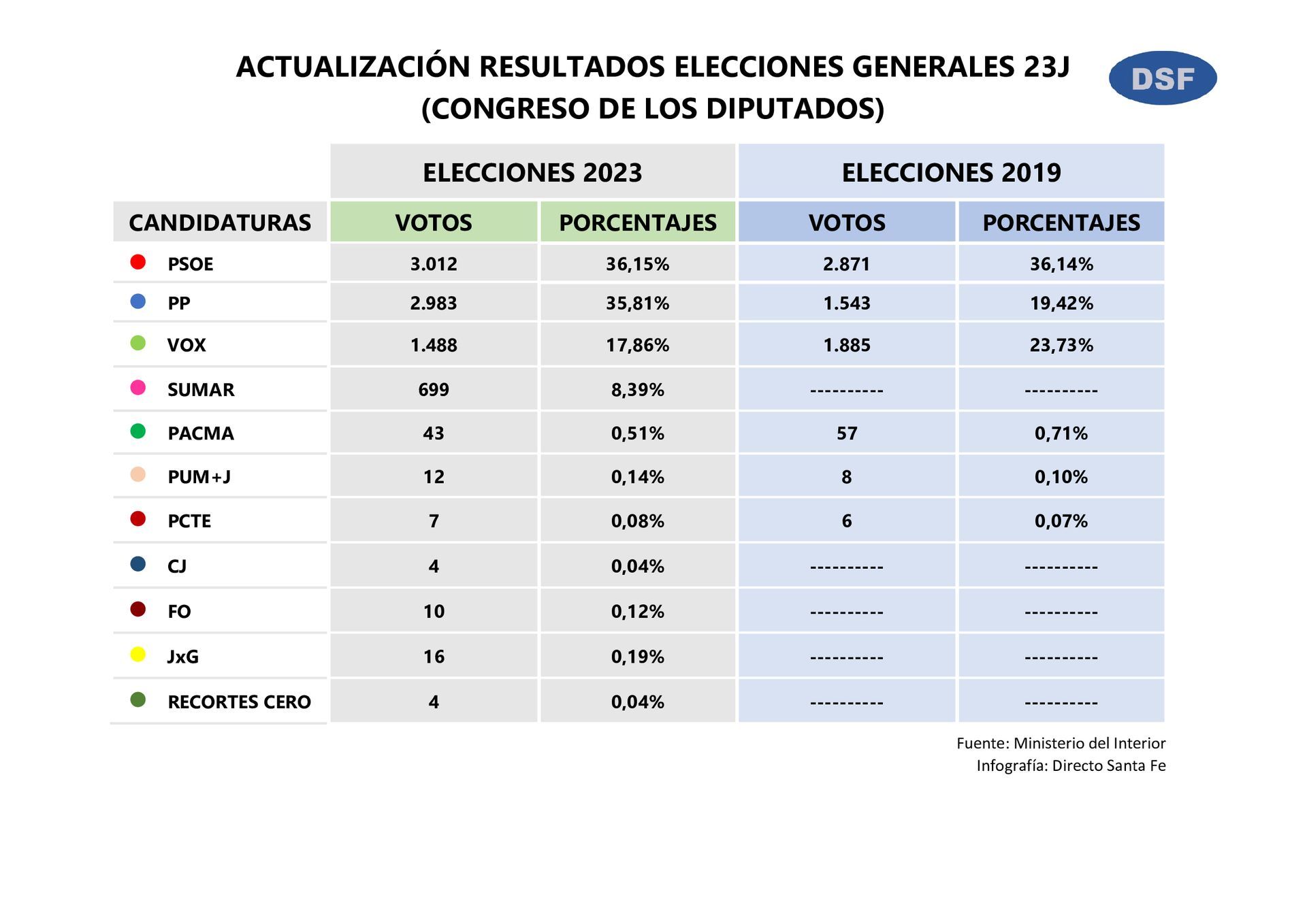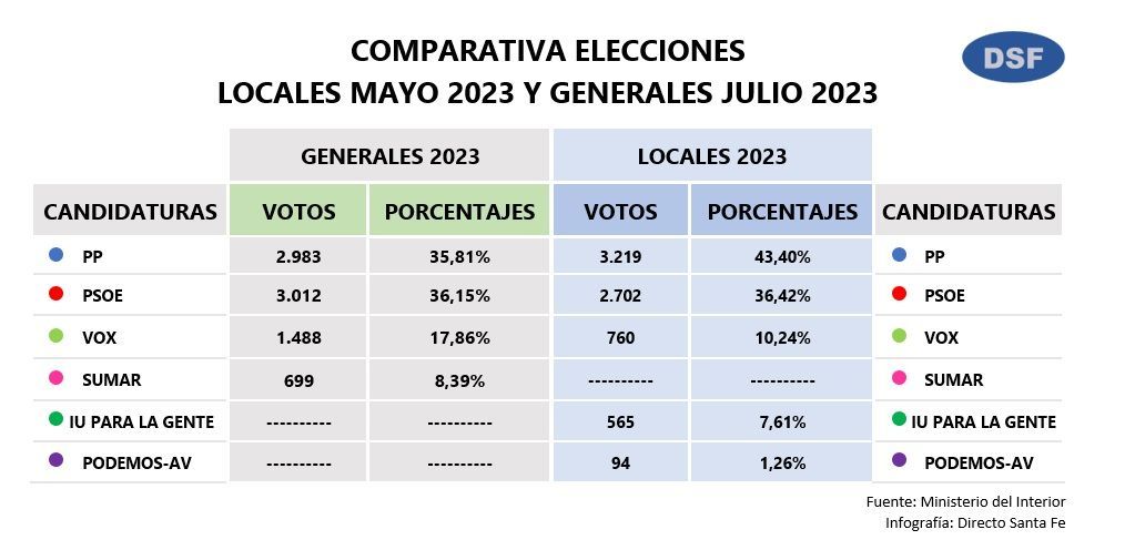 Con el 100% del escrutinio, el Partido Socialista se ha proclamado como ganador de las Elecciones a las Cortes Generales de este 23 de Julio, en el municipio de Santa Fe. De esta forma, el PSOE ha sido el ganador, con 3.012 votos y el 36,15% del total, seguido del Partido Popular, con 2.983 votos y el 35,81% del total, VOX con 1.488 votos y el 17,86%, y SUMAR, con 699 votos y el 8,39% del total. El resto de los votos se los llevan partidos minoritarios, que suman el 1,12% y siendo 96 votos en total.