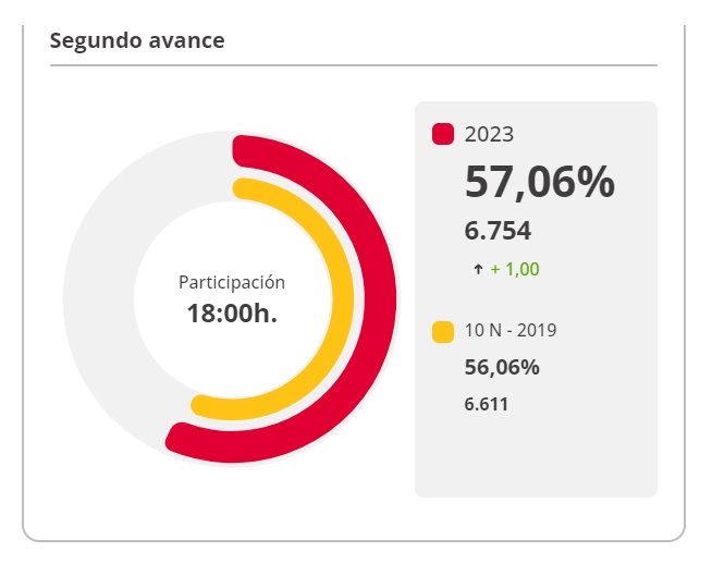 18:13h | En comparación con las últimas Elecciones Generales del año 2019, la participación, a esta hora de la tarde, ha ascendido en 1,00%, siendo 143 más, las personas que han votado hasta las 18:00h.