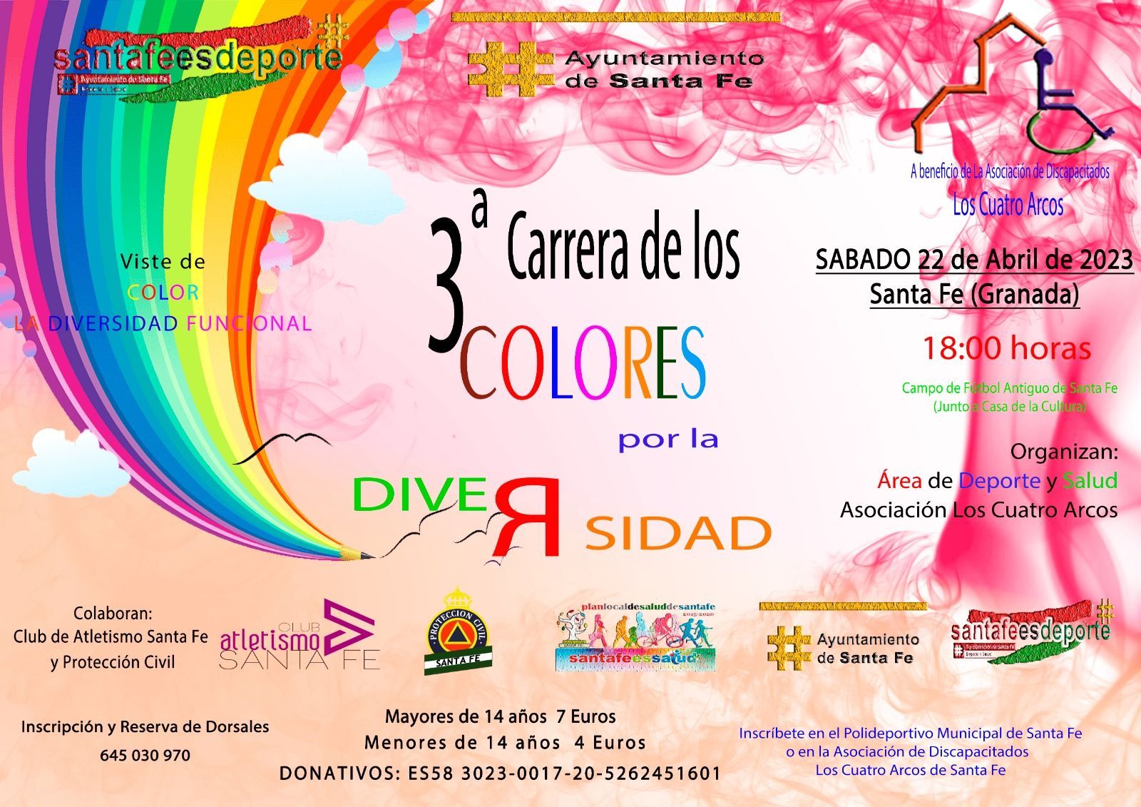 El próximo sábado, 22 de abril, a las 18:00 horas dará comienzo un año más la III Carrera de los Colores por la Diversidad, organizada por la Asociación de Personas con Discapacidad "4 Arcos" de la Ciudad y, en la que colaboran el Club de Atletismo Santa Fe, la Asociación "Santafeesdeporte", Protección Civil y el Ayuntamiento de Santa Fe.